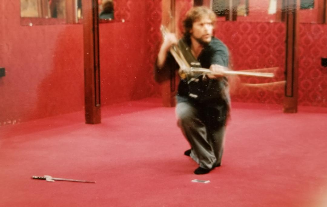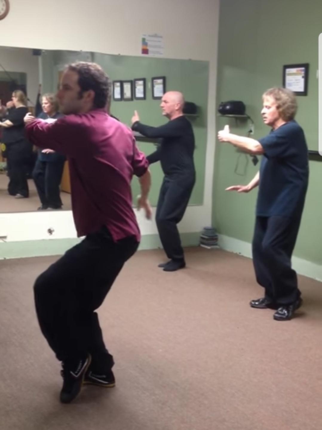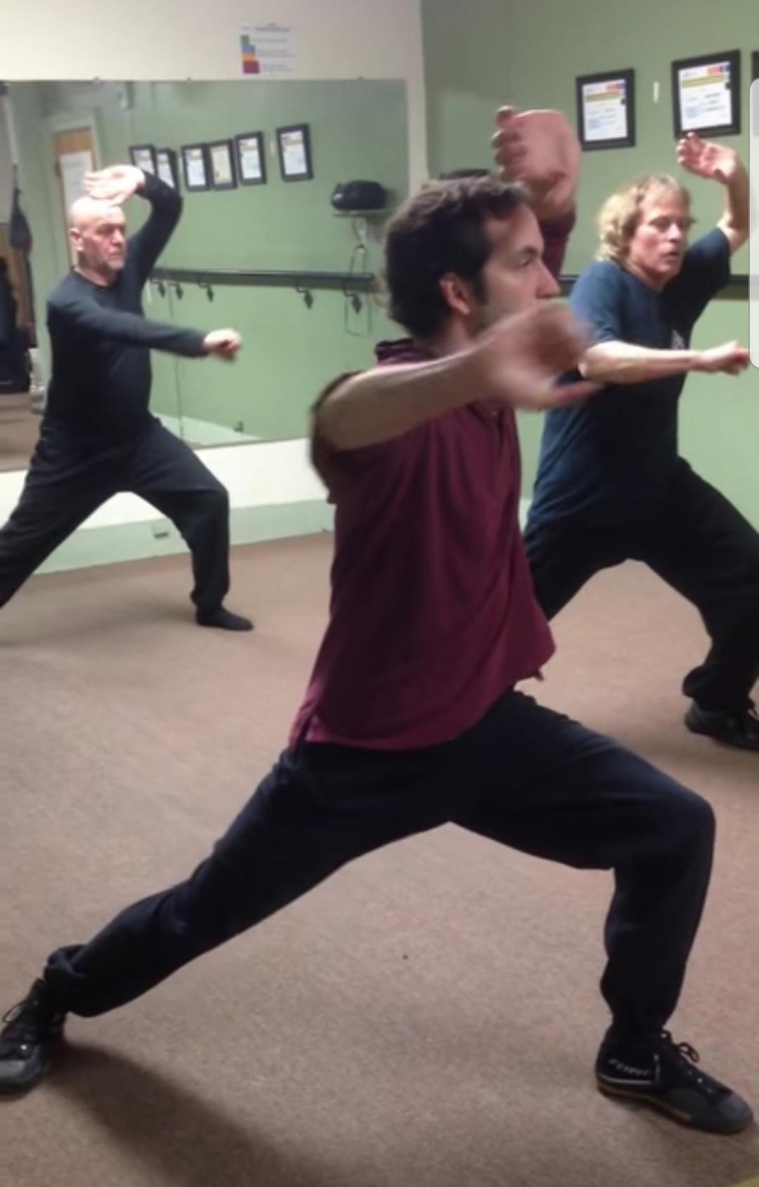 I trained under David at two different points in my life, in my early 40s and then later again in my late 50s. David was 7 years my senior and in his prime when I first trained under him at his Dojo in Albion NY. It was called Charisma Il – The Academy of the Integrated Martial Arts. His Kungfu included the 5 animal system much like the Kungfu TV show from the 70s that had a big influence on me. David Carradine’s character was trained in Tiger/Dragon and David taught Tiger/Crane. The interior of his dojo was red with low light revealing interesting weapons hanging on the walls. The workout room was a former dance studio with a wall lined with mirrors so we could watch ourselves train. Everyone dressed in black which suited me just fine. In true Kungfu tradition David didn’t talk much. He led and we followed his moves. His dojo was strict with clear rules. Tai chi preceded the Kungfu classes. Warm ups and stretching preceded the Yang style tai chi that I was most interested in. David would perform tai chi while naming each form as he went along and we would follow. Then we would proceed to the Kungfu warm ups which were basically the same as Tai Chi only faster. He would say, “All right…two hundred pushups!. You know who you are,” and he would proceed to do the two hundred quick and easily. I managed to get up to 90 at one point but it was never easy. David at times seemed to not weigh anything as he lightly and energetically moved about. But during sparring you saw his speed and power in action and it was most impressive. I attended all classes beyond my level and never mastered any of them but I surely did learn. I was a single dad with little time to practice outside of class which is a must to advance. But the tai chi did stick. At one point David, along with his wife and daughter opened up a coffee shop in Albion called Kafana’s. I had several art shows there being that David and I had mutual respect for each other’s art. He was a fan of my art which meant the world to me.